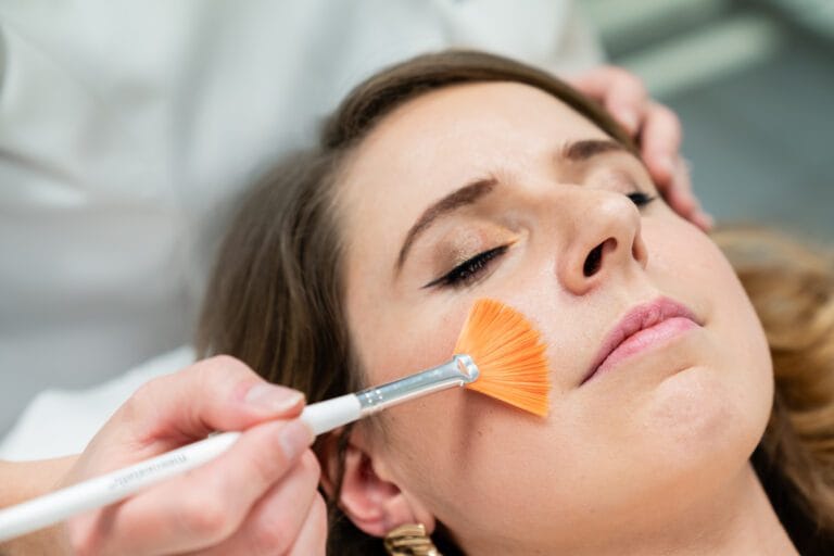 La peau est soigneusement nettoyée et démaquillée. Les zones sensibles sont protégées pour garantir confort et sécurité tout au long du soin. - Application du peeling Mesopeel